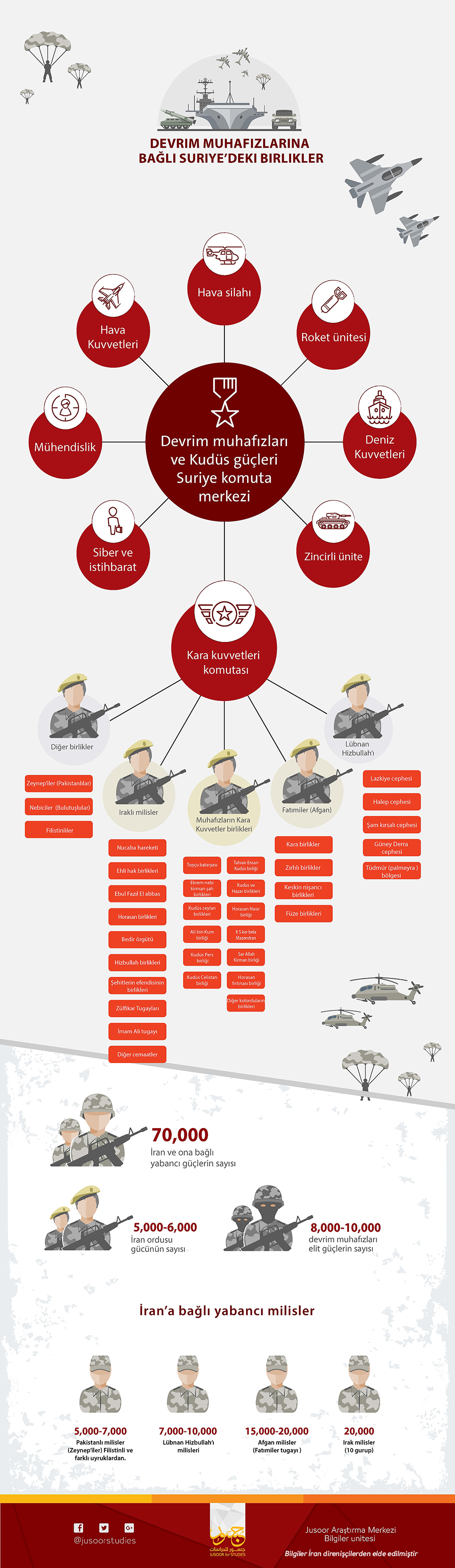 Türünde ilk olan bir belgeme ile İran Direnişi güçleri tarafından Suriye’nin farklı illerindeki İran birliklerinin dağılmış oldukları Karargahların konumlarını belirtti, Jusoor Araştırma Merkezi mümkün olan en büyük kitleye ulaşmasını sağlamaya çalışarak bu belgeleri görsel haline getirmiştir. Bu karargahlar İran Devrim Muhafızlarının ve onlara bağlı diğer milis birliklerinin Suriye’deki askeri operasyonların yönetme ve karar alma merkezleri olarak sayılıyor, mevcut sayılar ve dağılım bölgeleri onlara büyük kontrol ve nüfuz alanı verildiğini hatta çoğu zaman Rejim güçlerinin nüfuz ve kontrolünden daha fazla olduğunu bize göstermekte.
