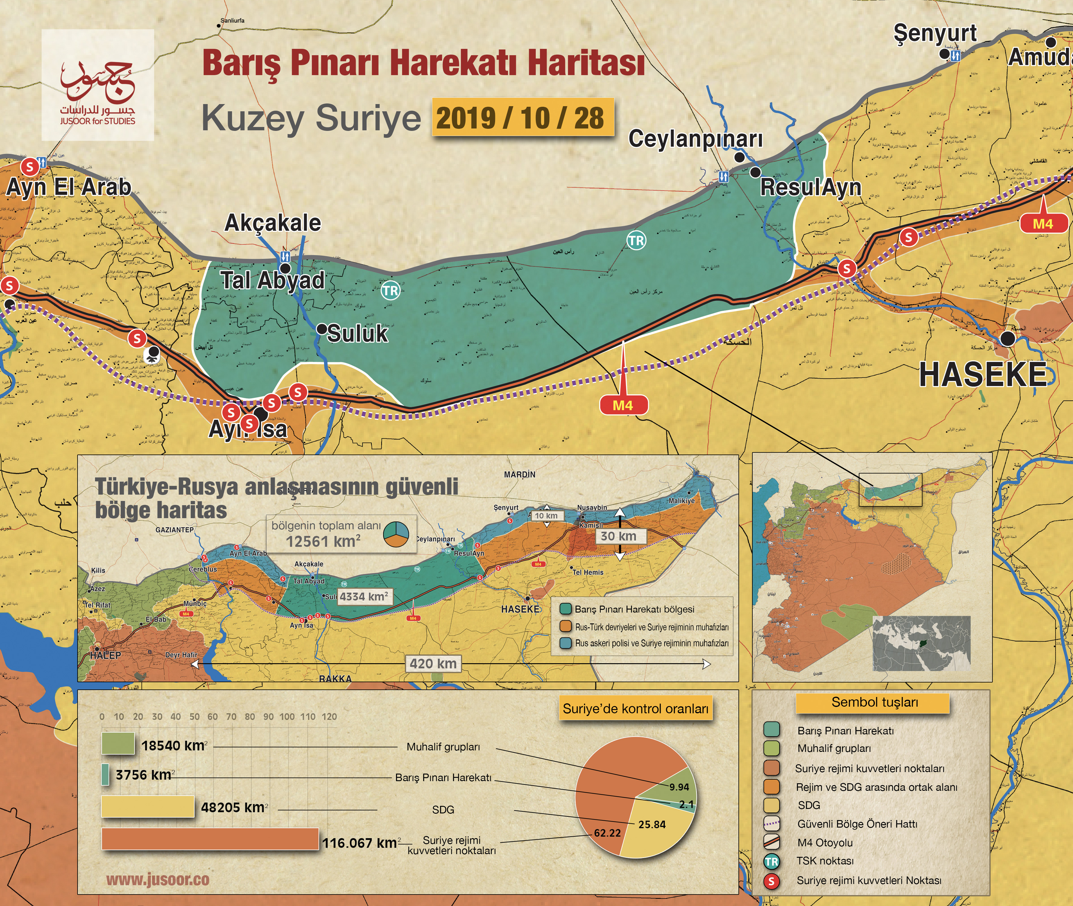 28 Ekim 2019’a kadar Suriye’deki nüfuz haritası, 22 Ekim’de kaydedilen oranlara göre Suriye topraklarında çatışan güçlerin kontrol ettiği toplam kontrol oranlarda yeni farklılıkları gün yüzüne çıkardı.