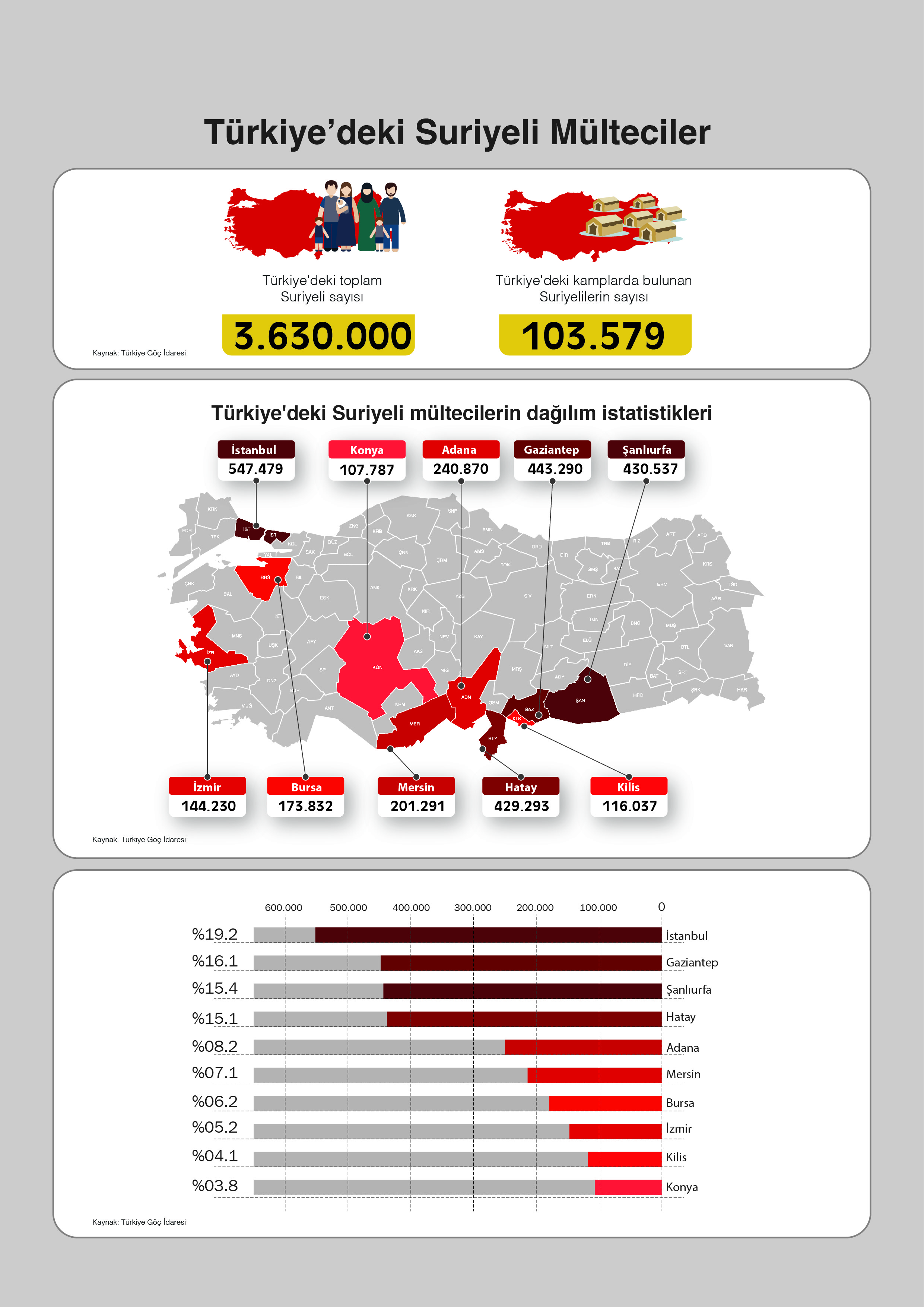Türkiye Göç İdaresinin yayınladığı son istatistiklere göre Türkiye’deki Suriyelilerin sayısı 3 milyon 630 bin kayıtlı kişiye ulaşmış durumda. Bunların 103579’u kamplarda yaşıyor.  İstanbul 547479 kişi ile en fazla Suriyelinin bulunduğu illerin başında geliyor. İkinci 443290 mülteci ile Gaziantep, üçüncü sırada da 430537 kişi ile Şanlıurfa geliyor.  Bkz. şekil- 1