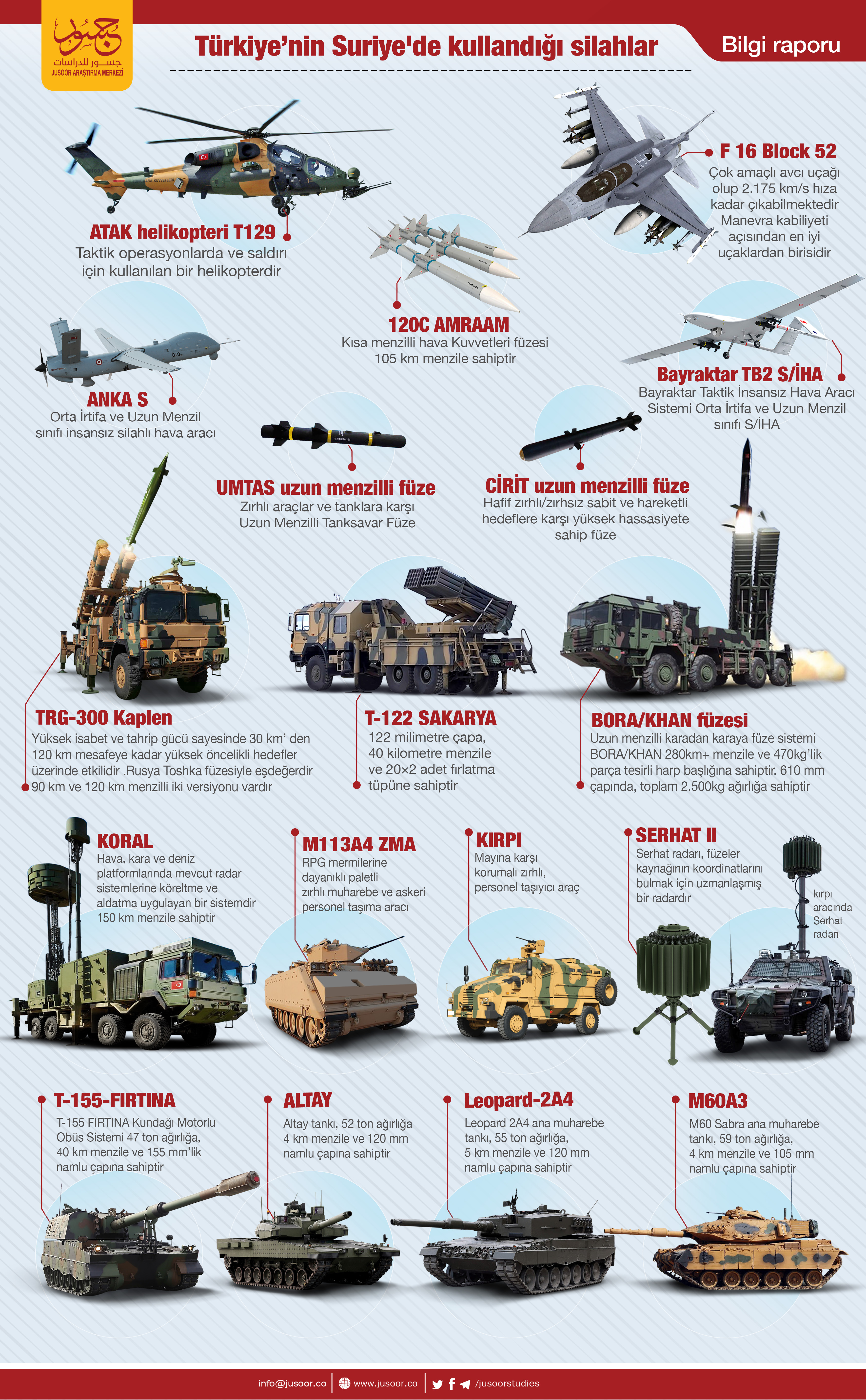 Türk ordusu Suriye’ye çok sayıda tank ve zırhlı araç gönderdi. Zırhlı araçlar arasında Leopard 2A4 tankı, Türk üretimi M60 Sabra tankı, Türkiye’nin geliştirdiği Altay tankı, ABD üretimi M113 paletli zırhlı araç, küçük boyutlu Humwee tipi zırhlı araç ve Kirpi zırhlı personel taşıyıcı bulunmaktadır.
